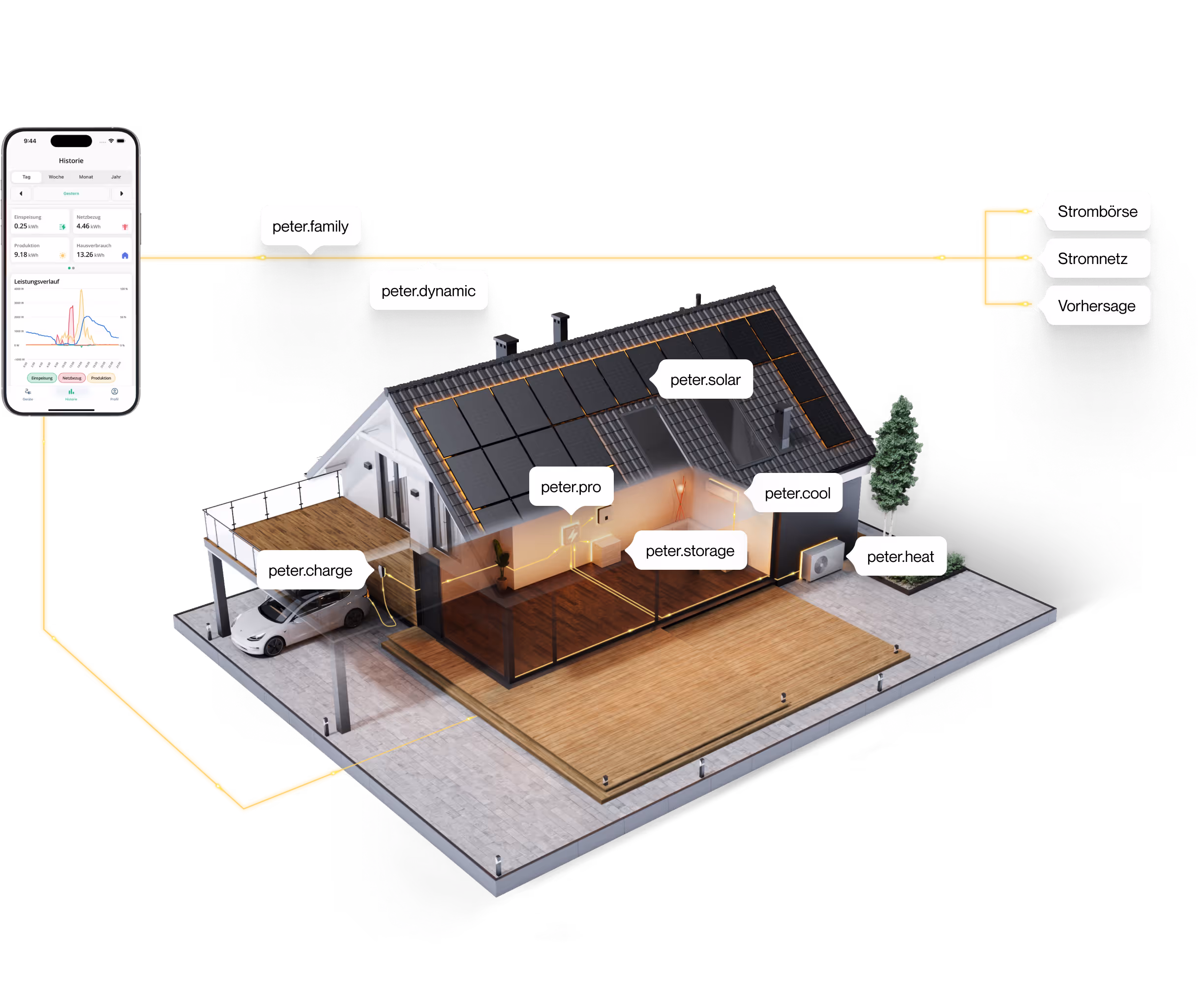 Der intelligente Energiemanager für dein Zuhause: Mit peter.pro steuerst du dein komplettes Energiesystem intelligent und effizient. Egal ob Stromspeicher, Elektroauto oder Wärmepumpe – unser virtuelles Kraftwerk optimiert deinen Stromfluss automatisch und nutzt die günstigsten Preise an der Strombörse.